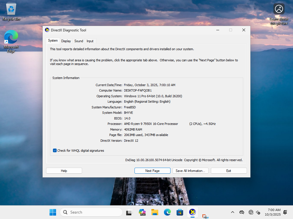 This is not a post about that though, it's specifically about getting Windows 11 installed on bhyve in the first place. Unfortunately, FreeBSD doesn't support the fTPM on my AMD motherboard, but I don't really care about TPM for my use case, I just need to bypass anything preventing me from installing Windows 11 in the first place. After many failed experiments, I was able to get it installed.